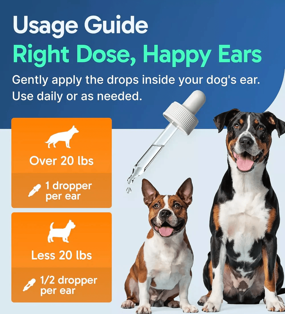 Gently apply one dropper per ear if your dog is over 20 pounds, or half a dropper per ear if your dog is under 20 pounds. After applying it, gently massage the base of the ear for 20 seconds to help the solution reach deeper into the ear canal.
